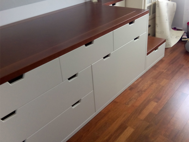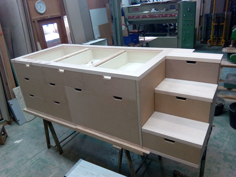 La base del colchón y peldaños escalera en madera de haya barnizado según muestra.