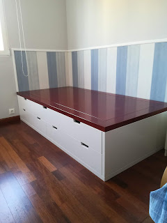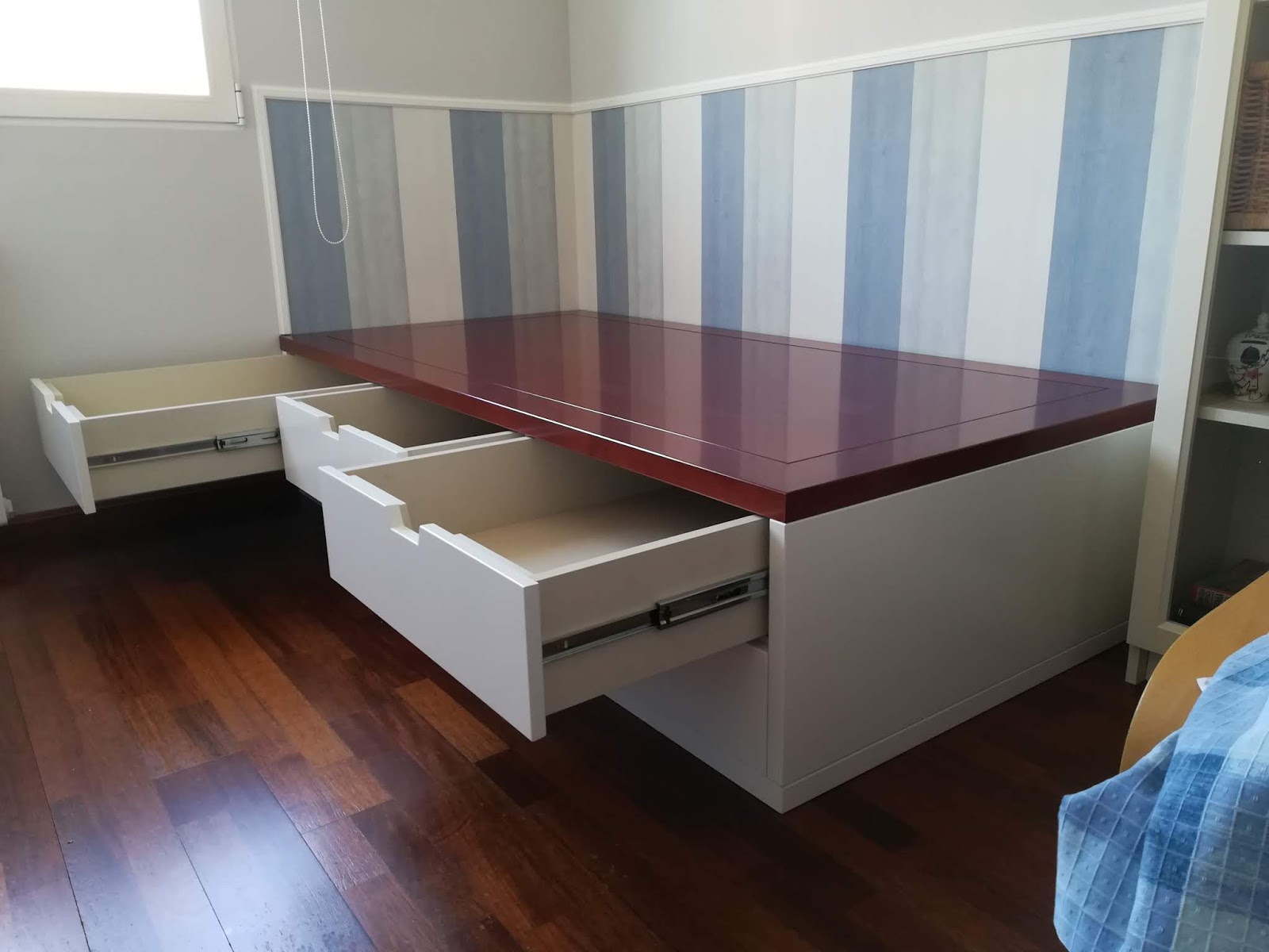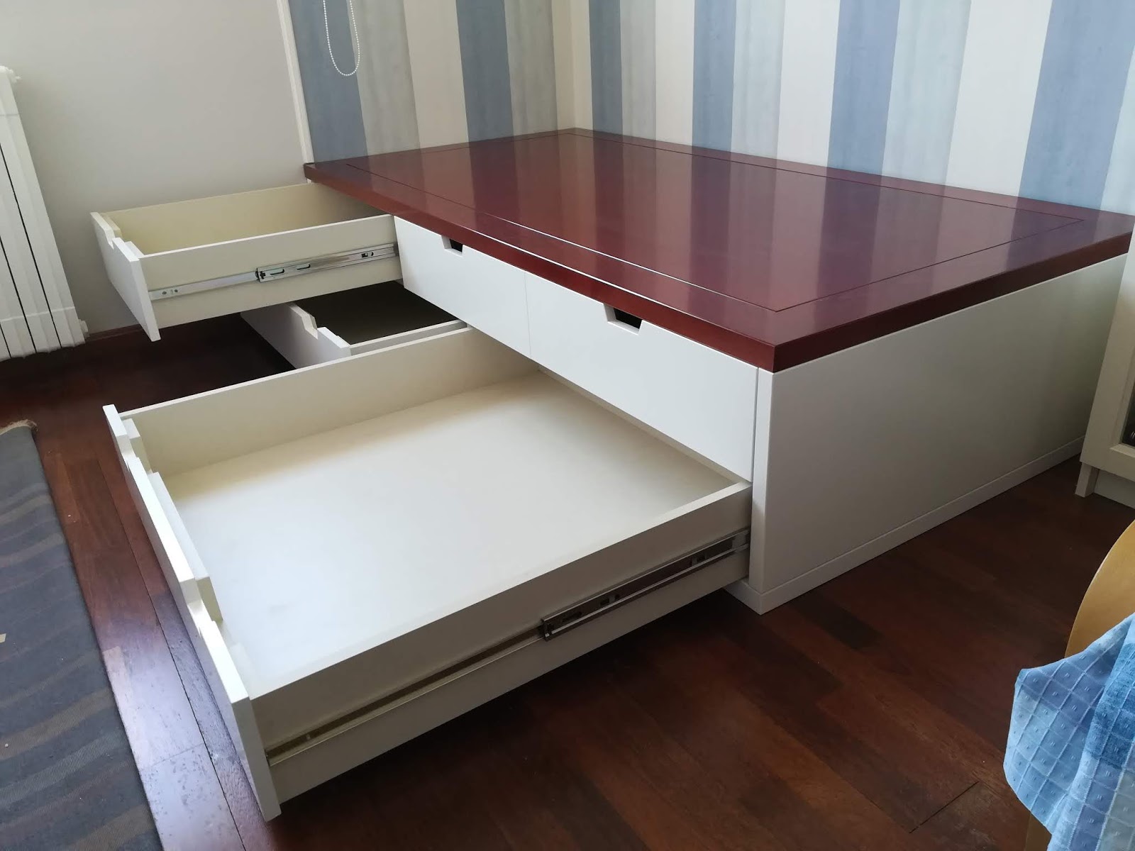 Camas por Carpintero en Zaragoza. Muebles cansado | 1 Dic 2019 | Cajones y cajoneras, Camas, Lacados, MaderasCama compacta con varios cajones contenedores bajo soporte lacada en blanco y tapa barnizada en color según muestra. Interiores de cajones en melamina. Realizada en mayo 2018 y entregada en zona de San Jose en Zaragoza.