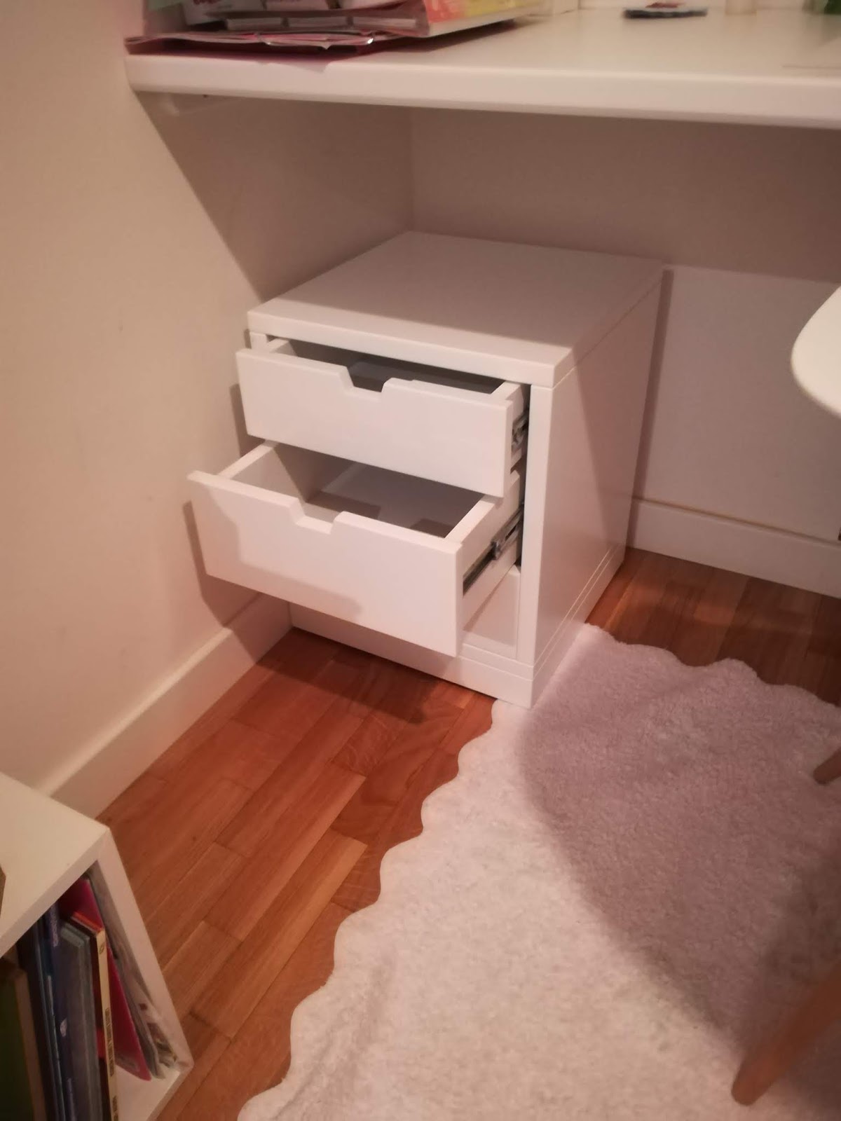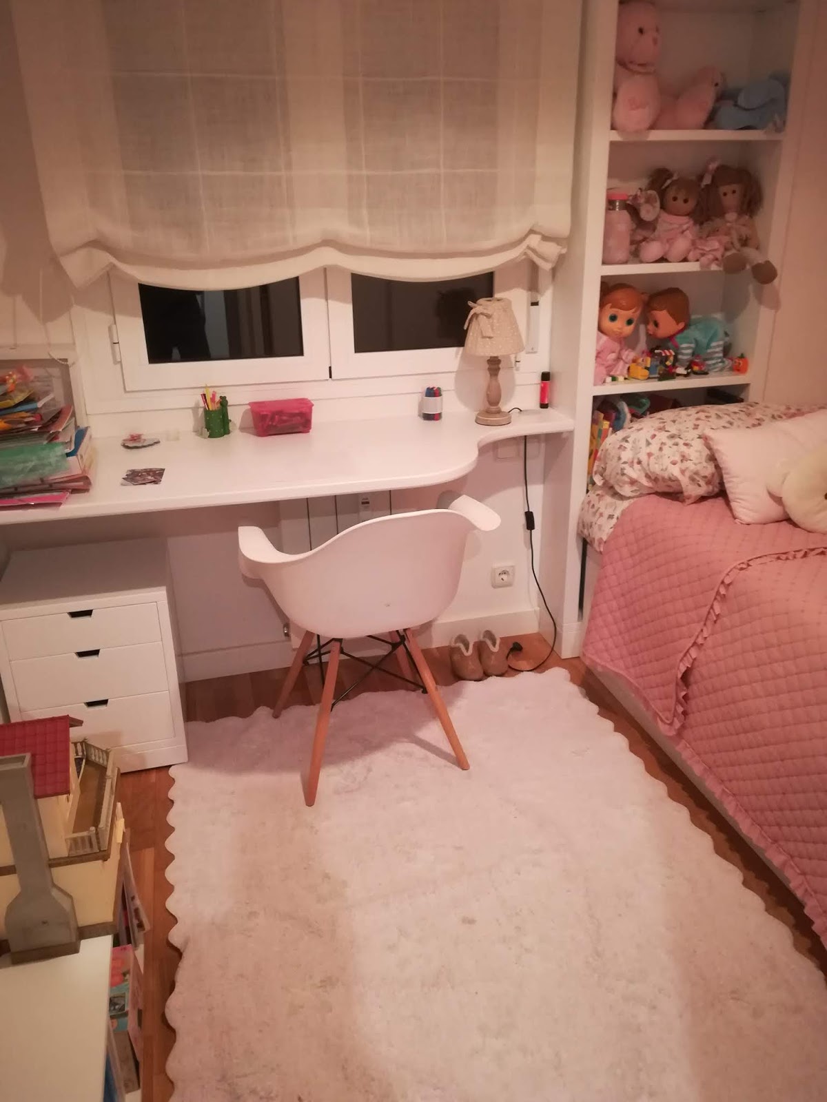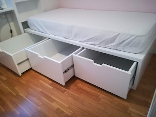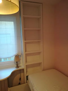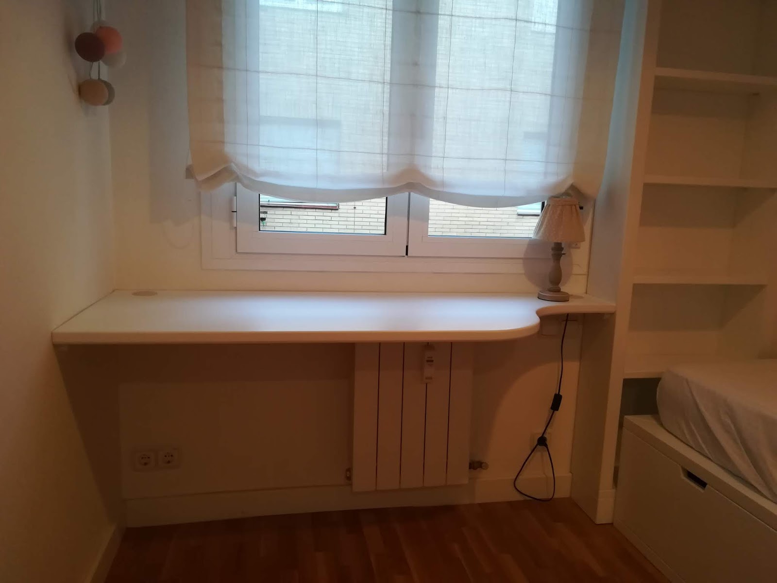 Conjunto de muebles para habitación infantil / juvenil lacados en blanco mate compuesto de cama con contenedores bajo la misma, estantería tras ella, tapa mesa estudio en formica blanca canteada en madera lacada en blanco y buk a modo de mesilla con ruedas y varios cajones. Realizado en setiembre de 2019 entregados en Cesáreo Alierta de Zragoza.