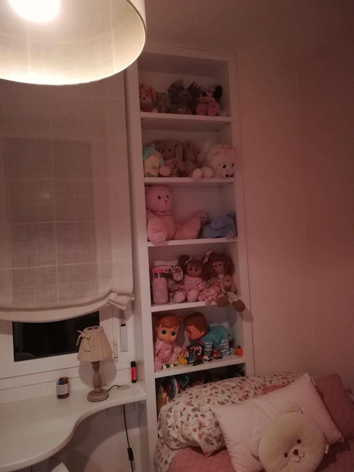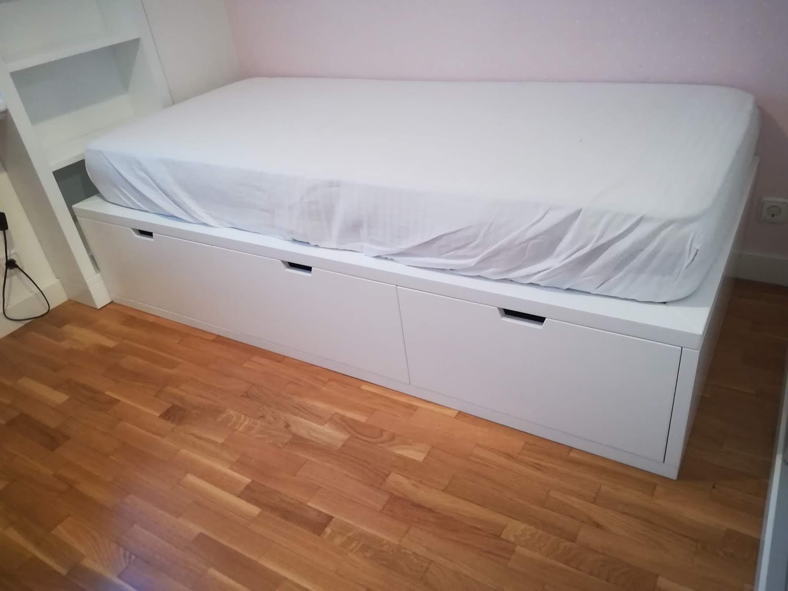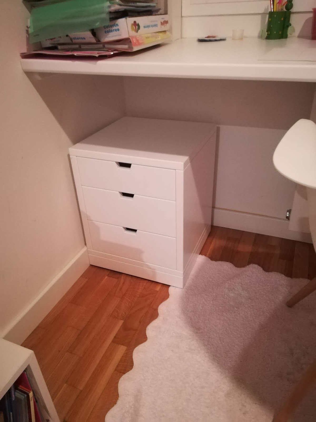 Conjunto de muebles para habitación infantil / juvenil lacados en blanco mate compuesto de cama con contenedores bajo la misma, estantería tras ella, tapa mesa estudio en formica blanca canteada en madera lacada en blanco y buk a modo de mesilla con ruedas y varios cajones. Realizado en setiembre de 2019 entregados en Cesáreo Alierta de Zragoza.