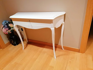Dos modelos de consolas lacadas en blanco, una de ellas con cajón, el otro a modo de cubreradiador, patas de estilo en madera de haya, tapas en tablero de fibras (DM) entregadas en Via Hispanidad de Zaragoza, noviembre de 2019