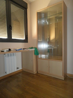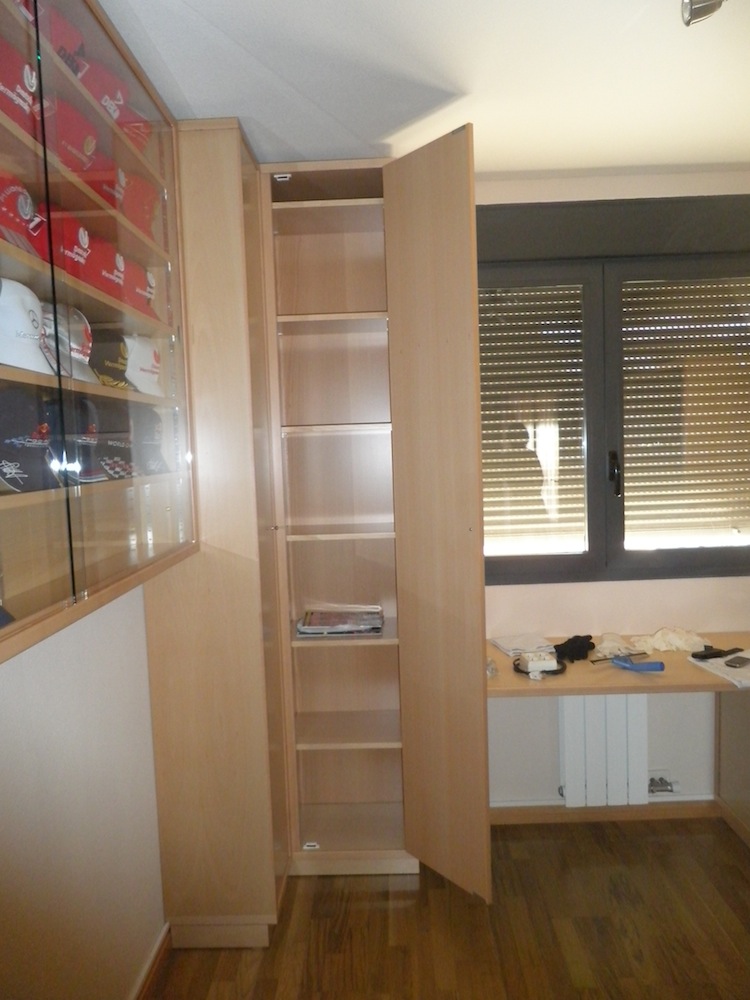 Habitación completa realizada en madera y chapas de haya barnizada en color natural, varias vitrinas cristales correderos, mueble cerrado, mesa estudio, puente sobre sofá uniendo dos muebles, aparadores de cristal, varias puertas ciegas.