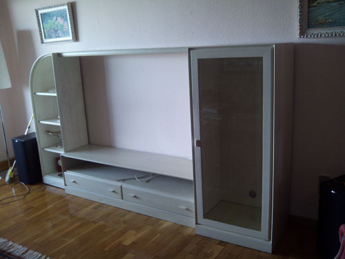 Pequeña librería para tv grande, fabricada en madera y chapas de fresno, y barnizada en blanco translúcido. Septiembre 2014, entregada en domicilio de Gomez Laguna en Zaragoza.