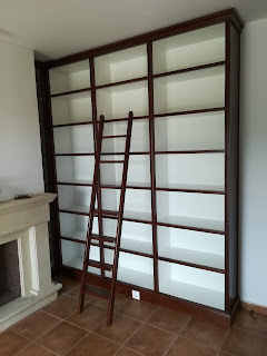 Librería en dos colores: lacada en blanco los interiores y en color nogal acahobado todos sus frentes y costado. Vease el detalle de la escalera mismo color nogal acahobado. Realizada en madera de haya y tableros de fibras para el lacado.
